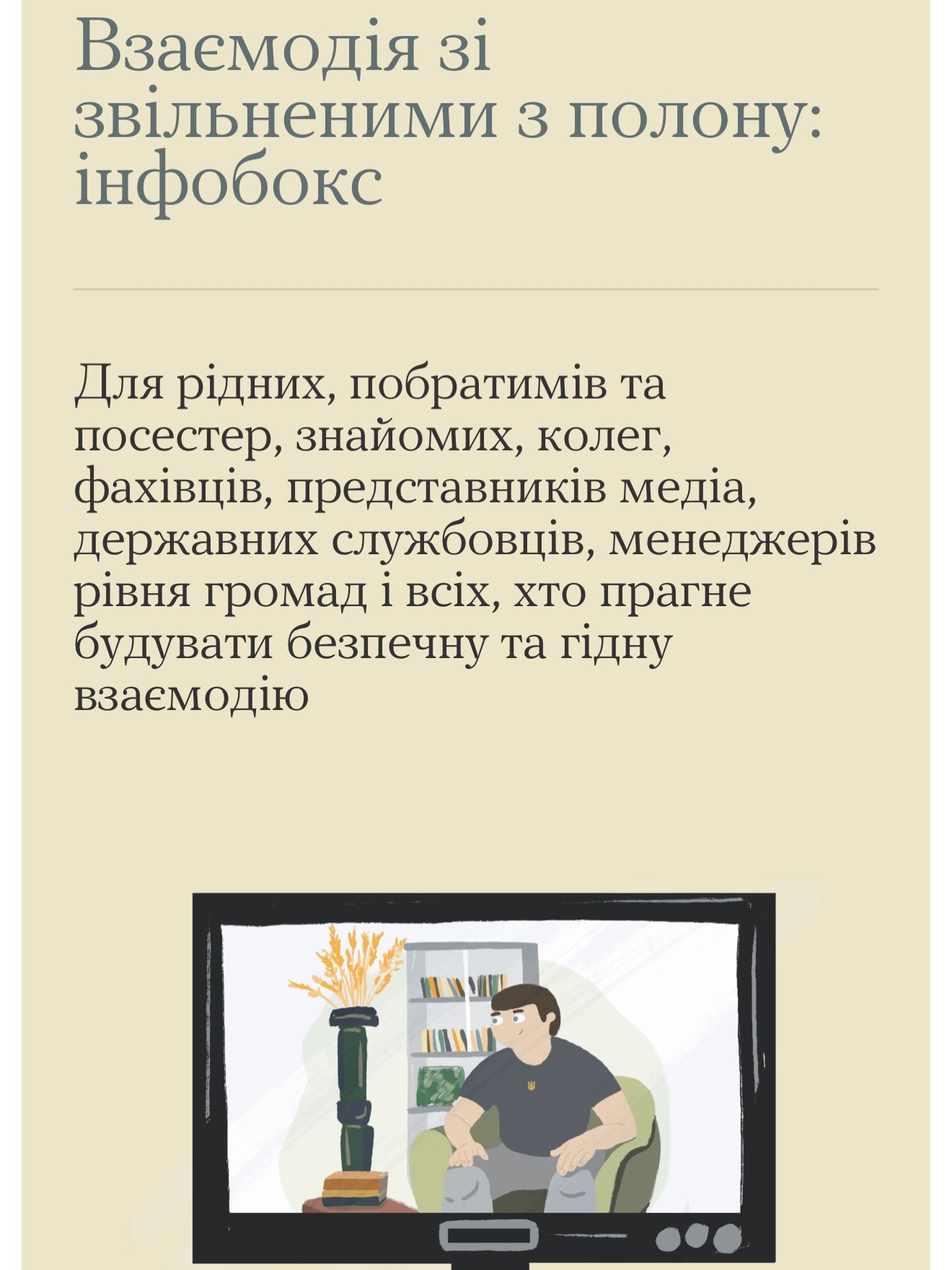 1)Освітній серіал “Не нашкодь: підтримка після звільнення з полону” (10 серій), розміщений на платформі “Дія.Освіта”, він надає практичні рекомендації щодо уникнення стигматизації та повторної травматизації звільнених осіб;